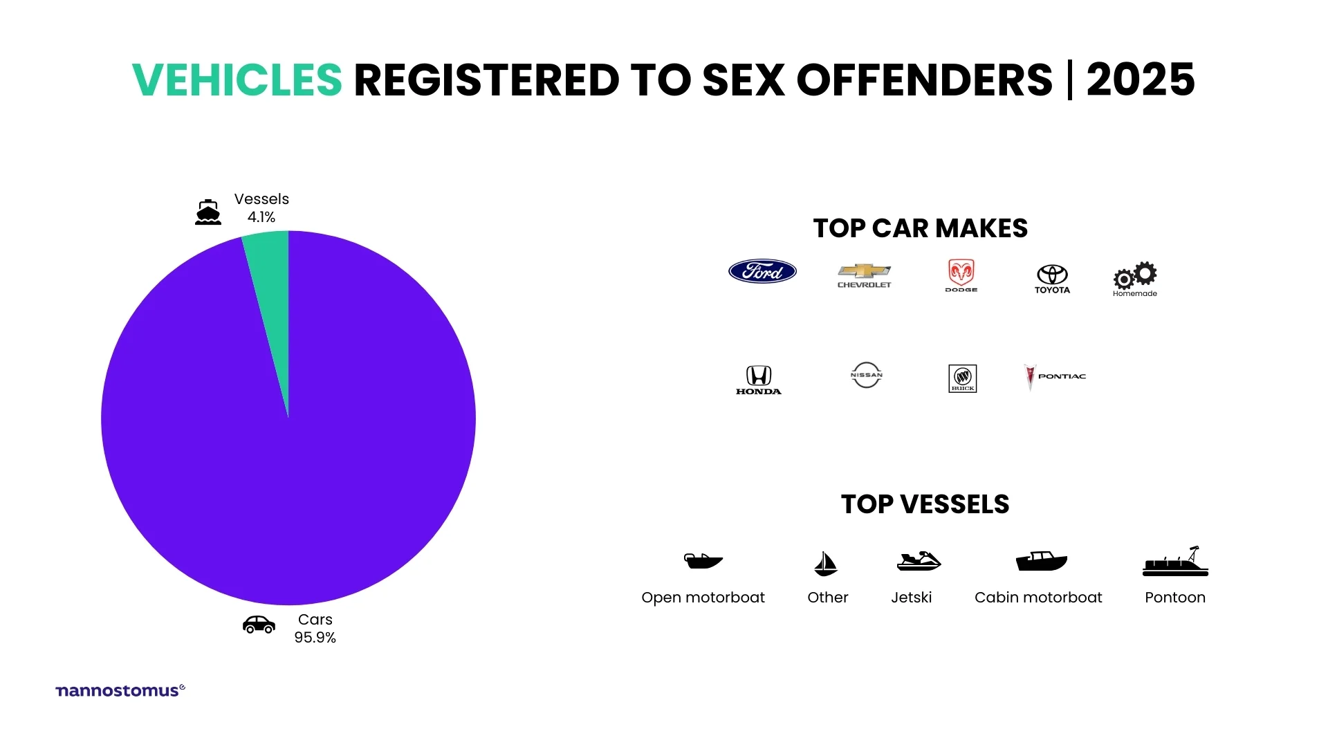 Ford, Chevrolet, and Dodge are the most common car makes among convicted sexual offenders.